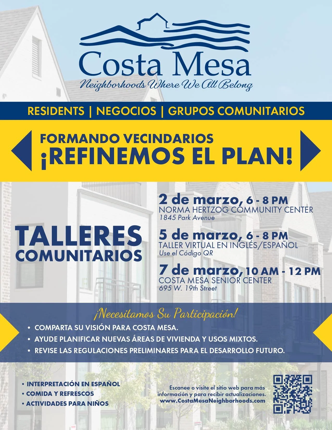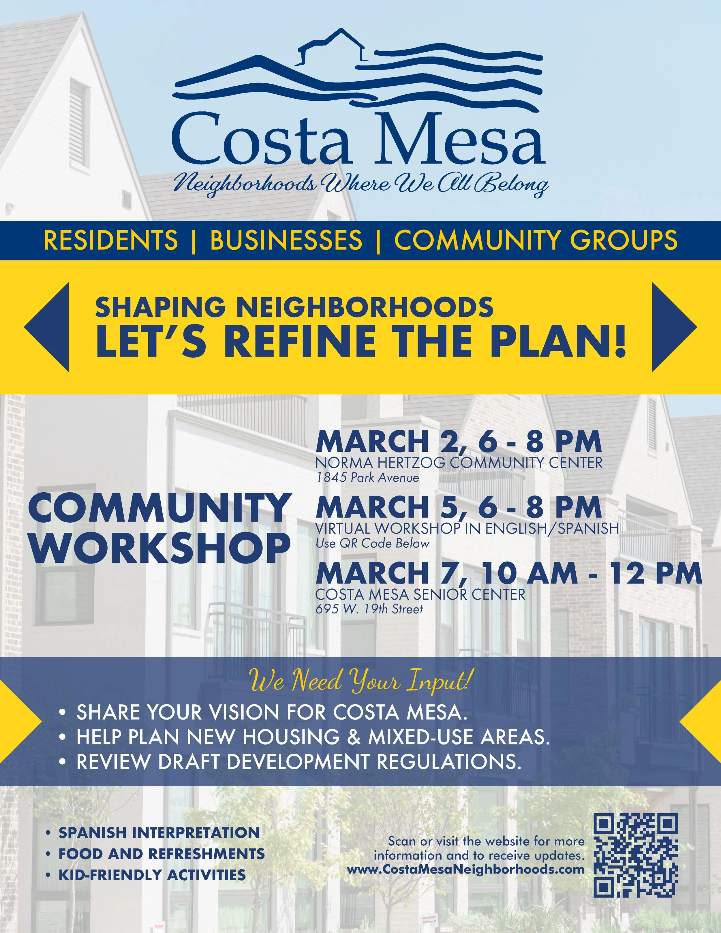 The City of Costa Mesa invites the community to participate in 3 upcoming community visioning workshops in March 2026. Click below for more information.